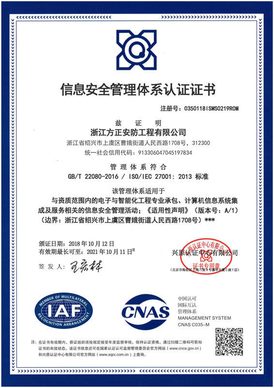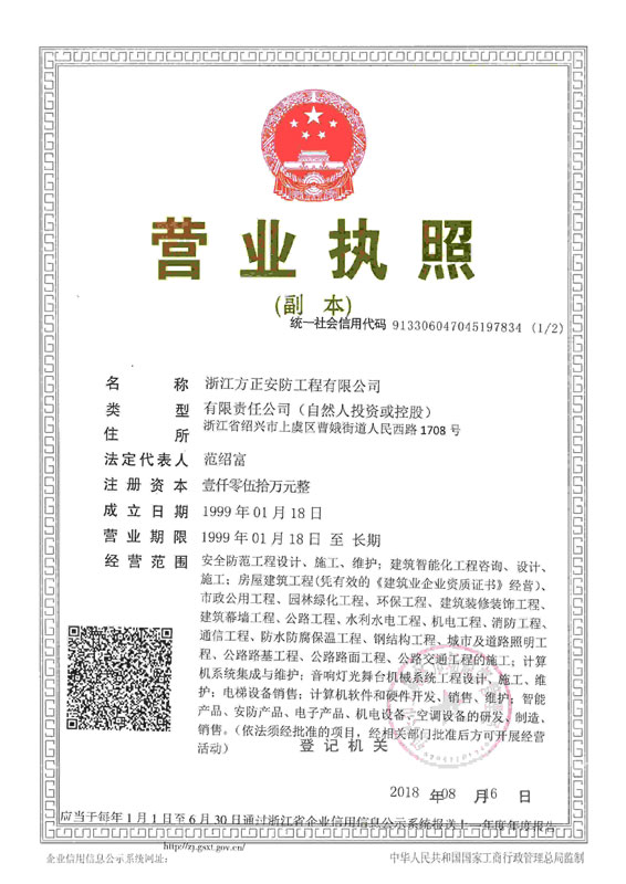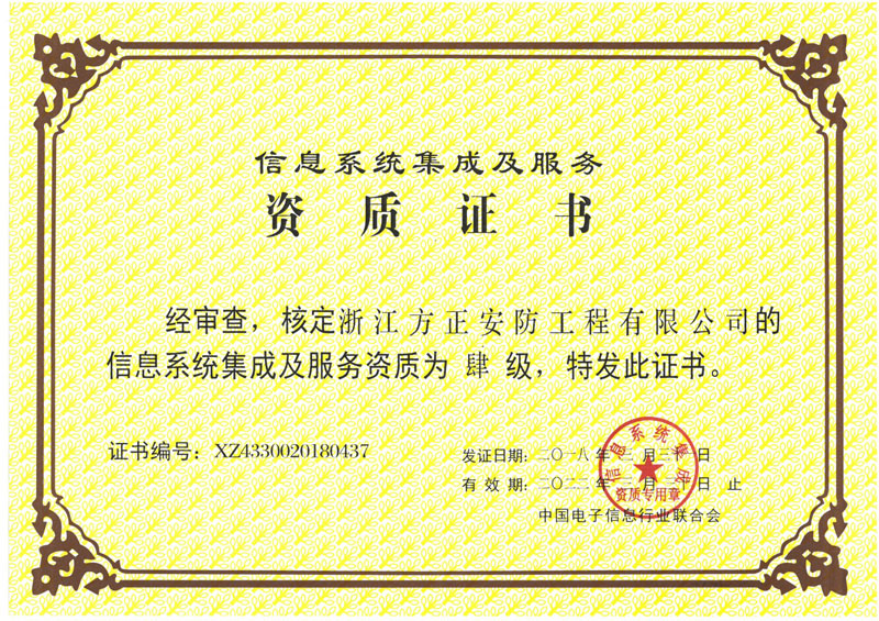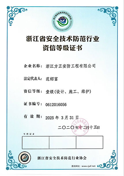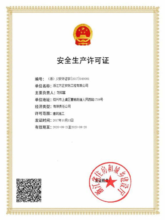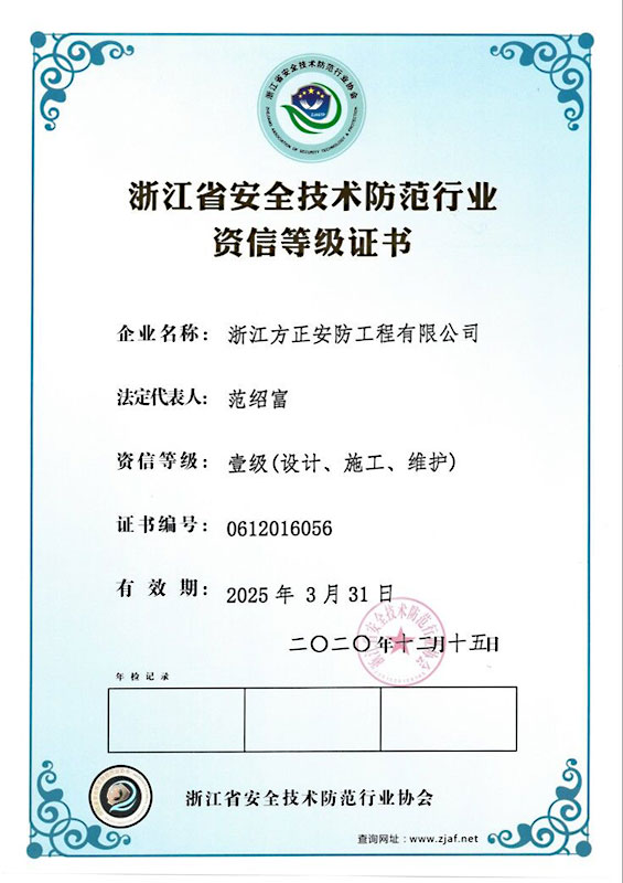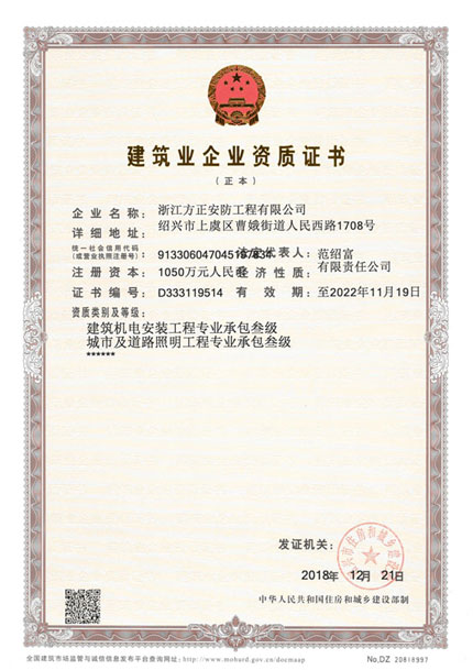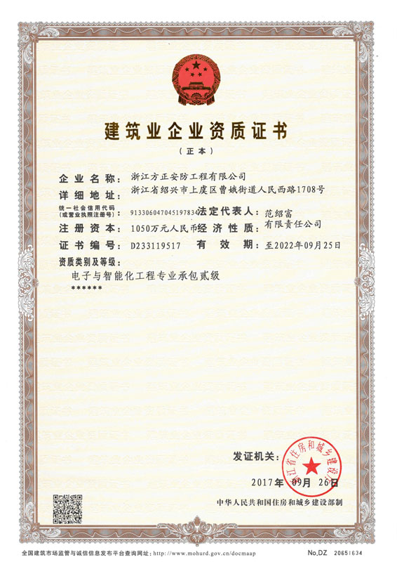 已取得浙江省公安廳頒發的《浙江省安全技術防范行業資信等級壹級證書》、浙江省住房和城鄉建設廳頒發的《電子與智能化工程專業承包貳級》、《安全生產許可證》、《建筑機電安裝工程專業承包叁級》、《城市及道路照明工程專業承包叁級》